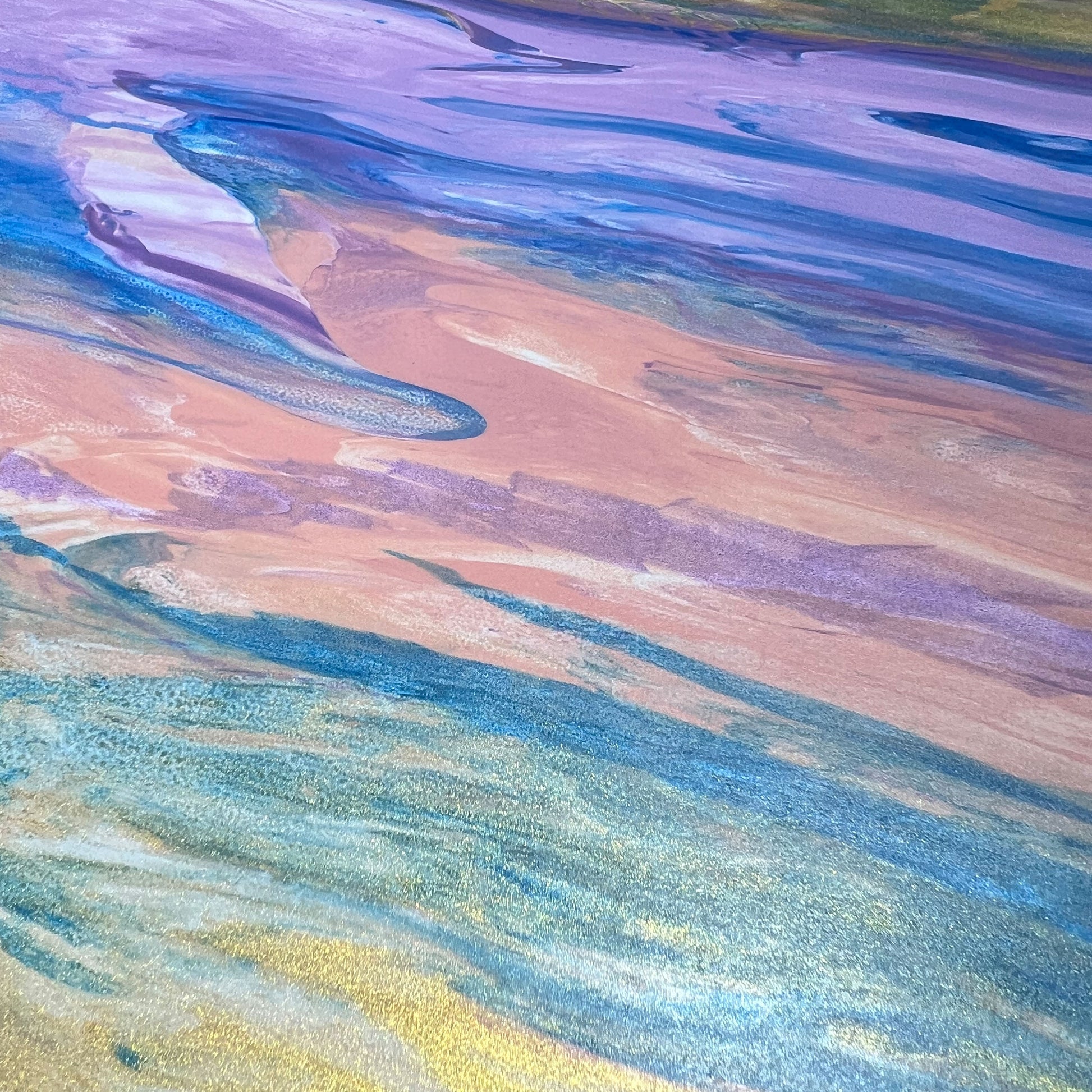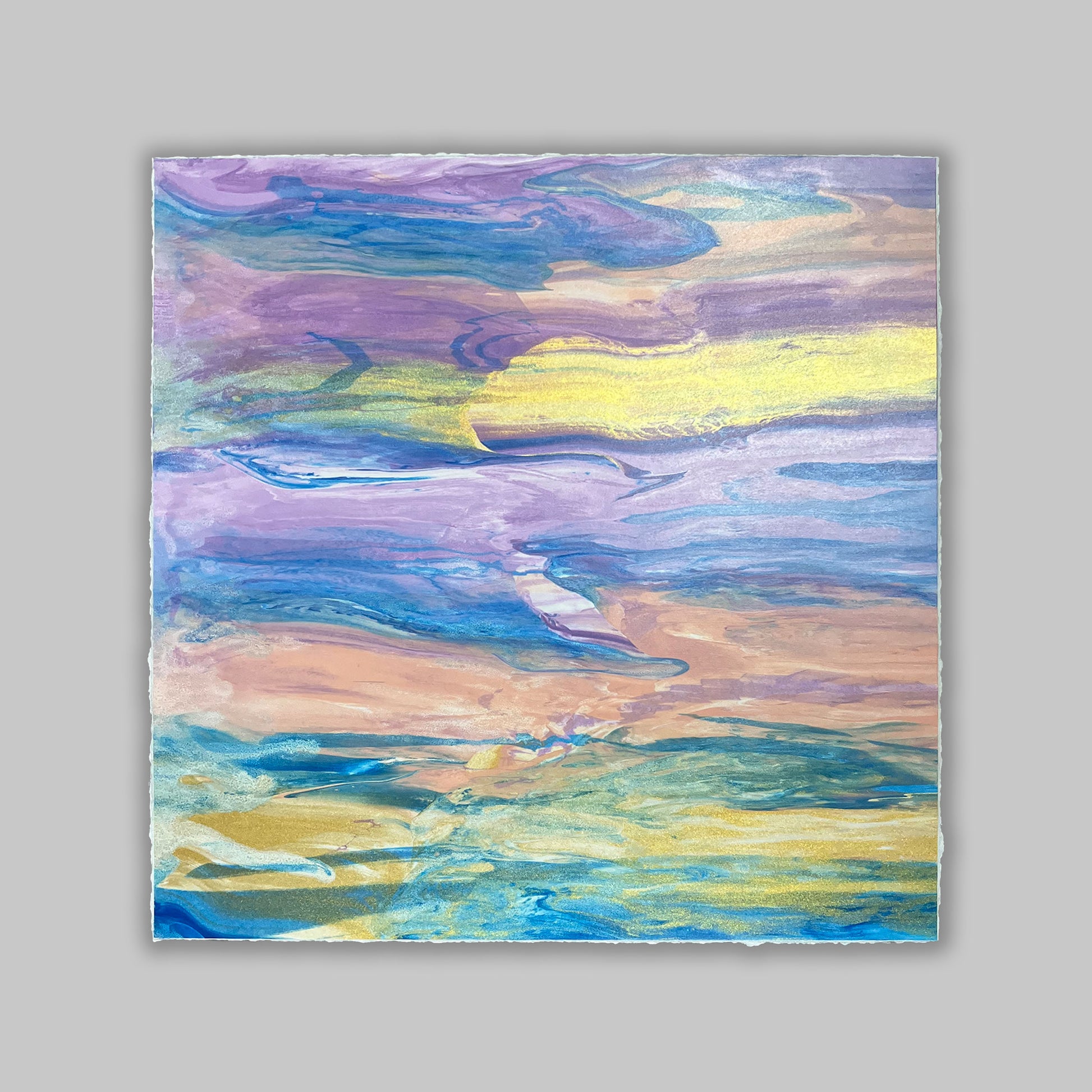 The result of experimentation in using screen printing ink, iridescent additives and the beautiful chaos of adding water live on screen to this mixtures to have resulted in this wistful and bright monoprint. It's a one of a kind as using this technique makes replication even for a variable edition impossible.